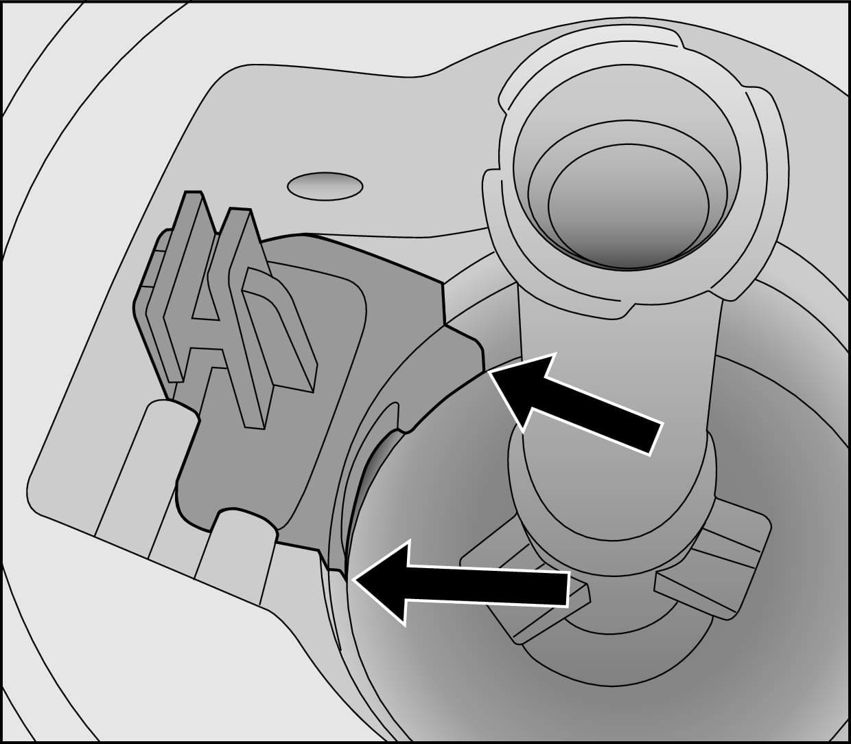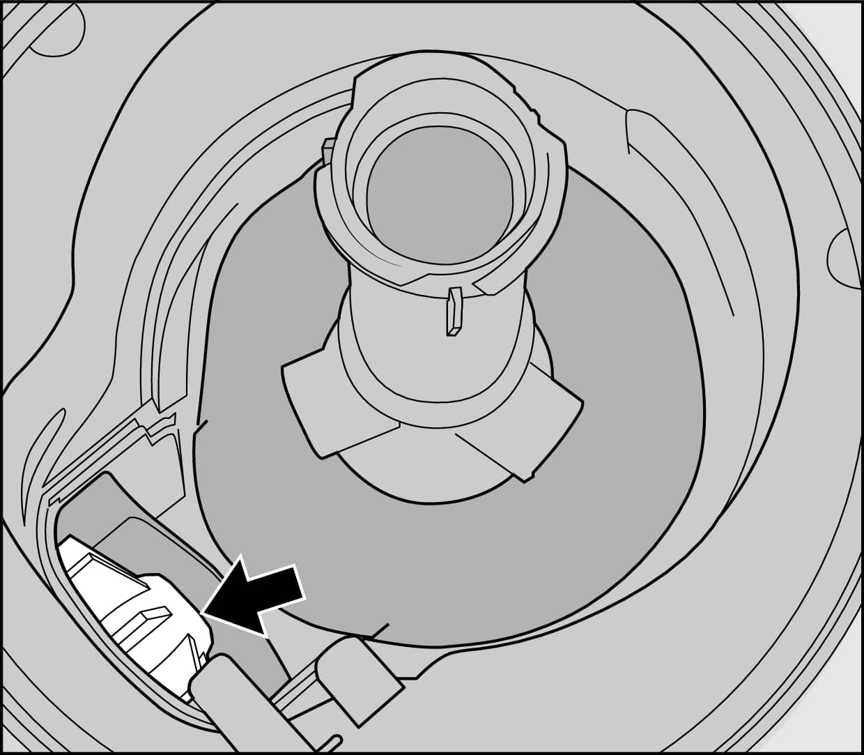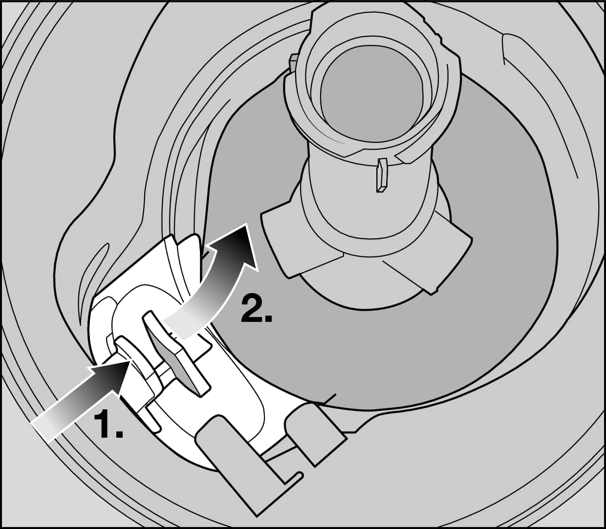 Zatlačte západku krytu vypouštěcího čerpadla dovnitř (1).