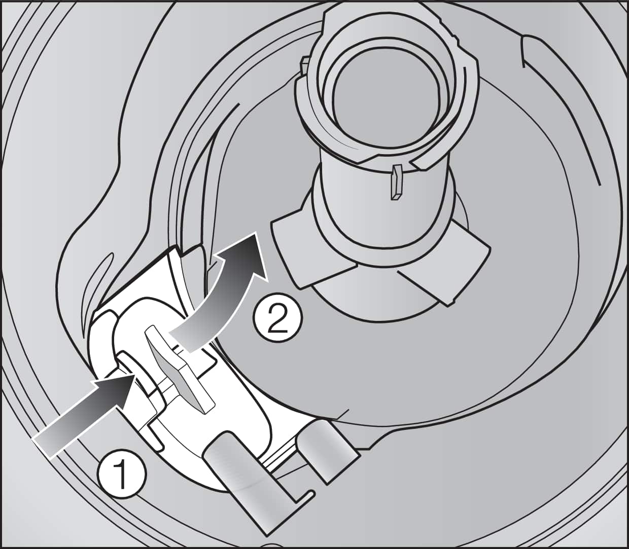 Zatlačte dovnitř zámek krytu vypouštěcího čerpadla (1).
